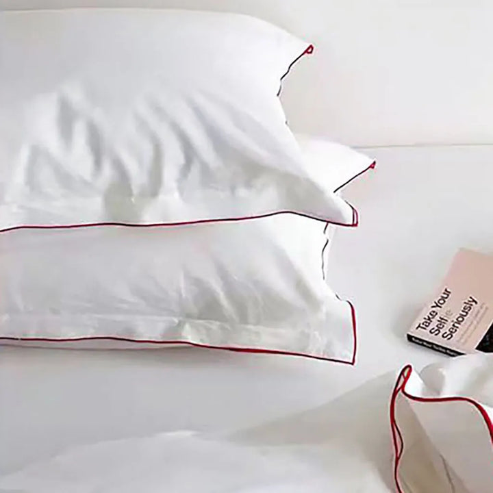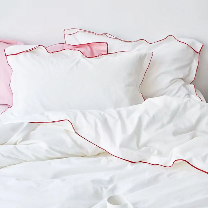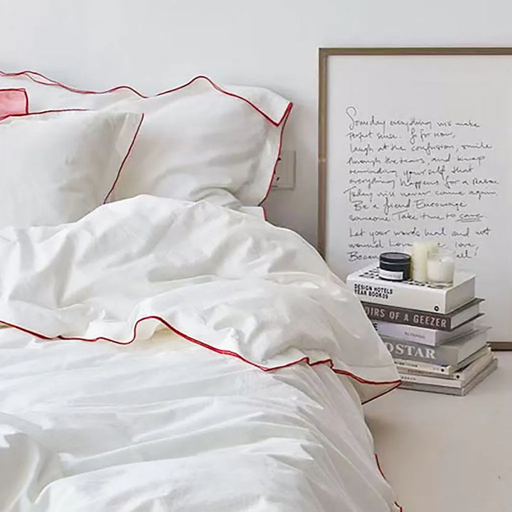 Designed with a nod to timeless elegance, this bedding set redefines simplicity with a bold twist. The crisp white base is finished with a bold red edge, adding just the right pop of retro style. Made from 100% cotton, it's soft, breathable, and perfect for everyday comfort. We love how it keeps things clean and classic, with that nice touch to make it stand out!