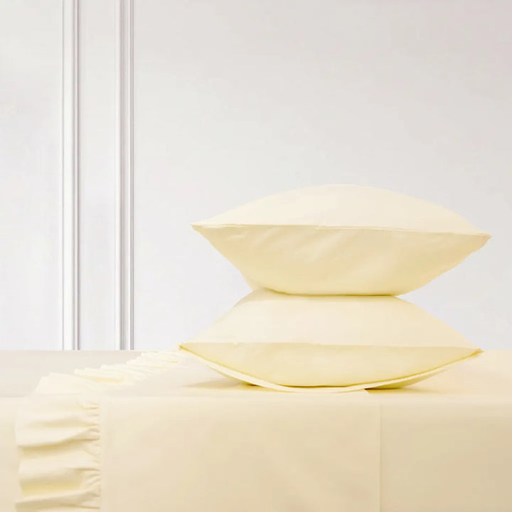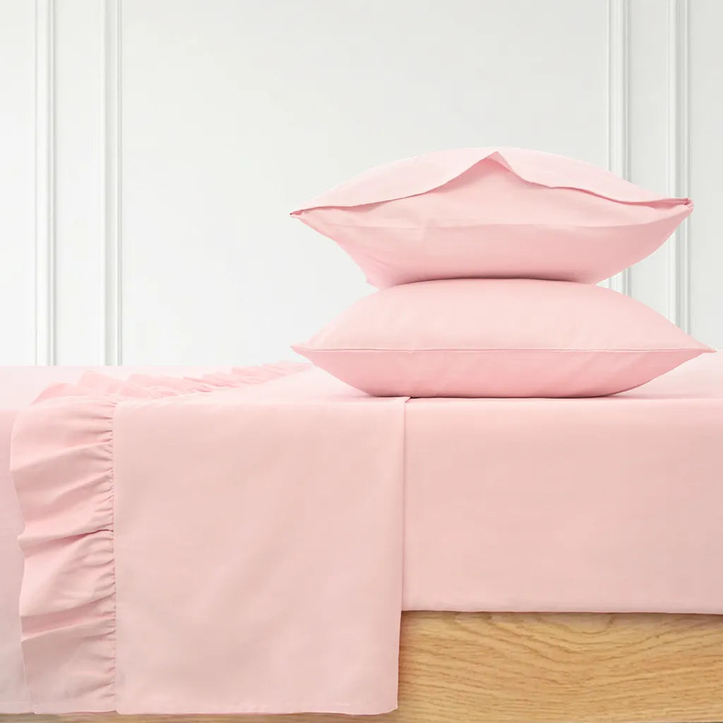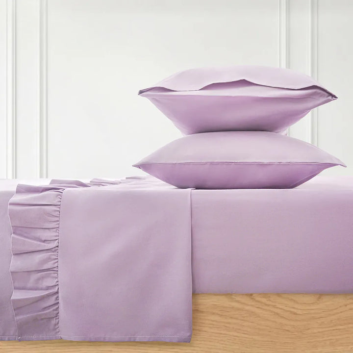 Made from 100% brushed cotton with a 300 thread count, this ruffled sheet set offers the same soft, breathable comfort you love, finished with a delicate ruffle for a more feminine touch. The gently worn-in feel is smooth against the skin and ideal for everyday sleep.