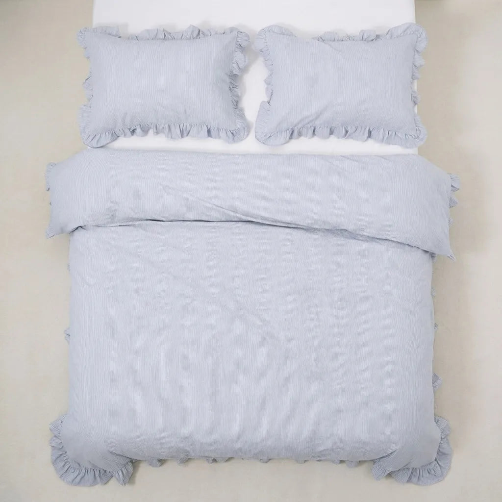 Classic stripe pattern with feminine ruffled trim for timeless charm. The blue tones create a calm, airy vibe that feels both vintage and refreshingly modern. Made from breathable cotton, it’s designed to keep you comfortable through every season.